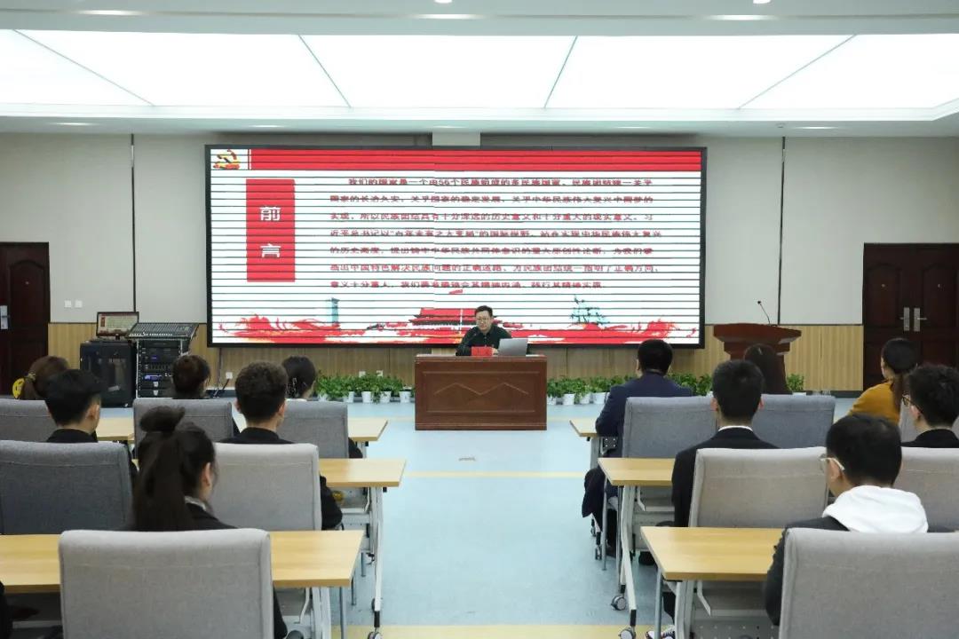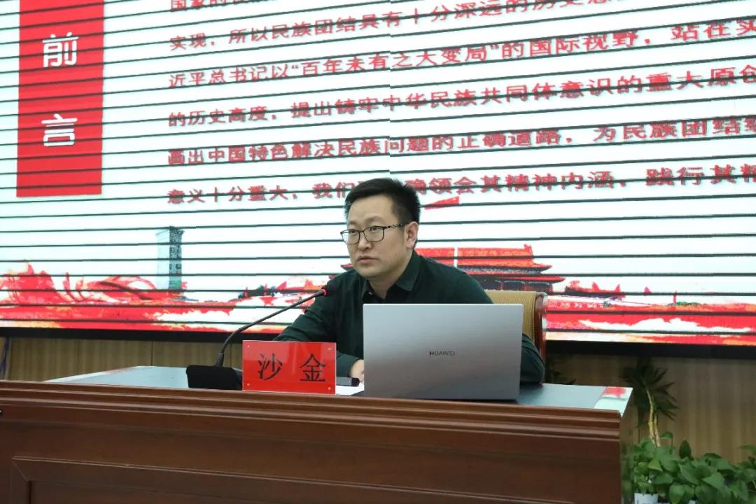 3月12日,Beat365唯一官方网站在学生事务中心一楼报告厅举办铸牢中华民族共同体意识专题讲座。学院党委副书记、副院长沙金以“铸牢中华民族共同体意识共圆伟大中国梦”为主题,给Beat365官网全体辅导员、学生干部上了一堂生动的民族工作理论课。