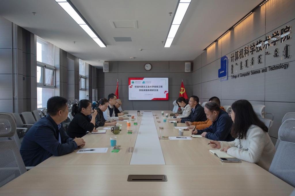 3月26日上午,内蒙古工业大学信息工程学院党委书记刘建国、院长黄平平一行6人到Beat365官网调研交流,Beat365官网党委书记乌日其木格、院长王海龙热情接待,双方就党建引领高质量发展,教学质量管理体系建设、教学评估与监控机制、教师培训与发展、人才培养方案、校企合作、团学工作等方面开展深入交流。内蒙古工业大学信息工程学院副书记、副院长佟姝婕、副院长张占强、组织员许霞、党委组织部组织科科长吴晓妹陪同调研。