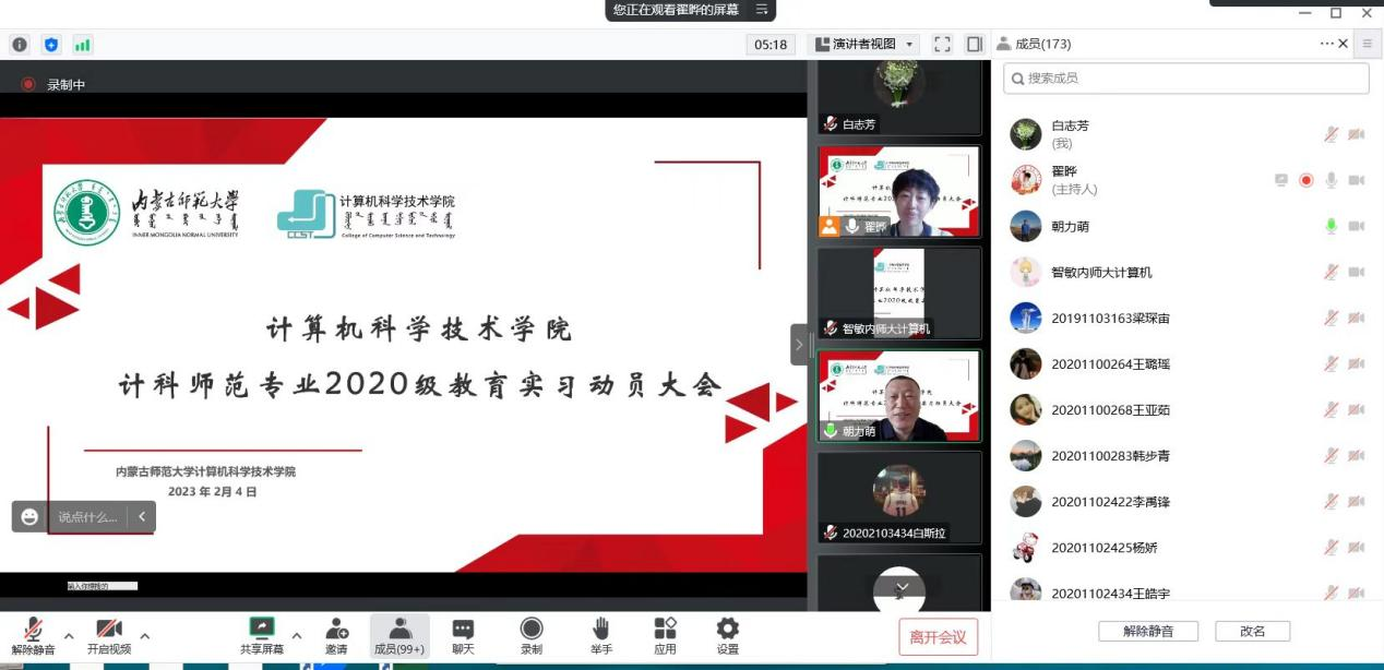 2023年2月4日上午,Beat365官网以线上腾讯会议的方式召开了2020级计科师范专业教育实习动员大会。学院院长林民、副院长智敏、计算机系系主任朝力萌、副主任翟晔、副主任王春晖、教育实习指导老师和辅导员参加了会议。