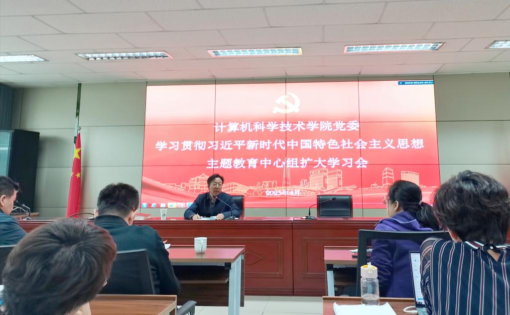 4月27日下午,Beat365唯一官方网站党委学习贯彻习近平新时代中国特色社会主义思想主题教育党委理论学习中心组扩大学习会在赛罕校区信息楼会议室举行。学院党委书记、院主题教育领导小组组长玉柱主持会议并全程领学,学院全体党委中心组成员、党支部书记、系部中心主任参加会议。