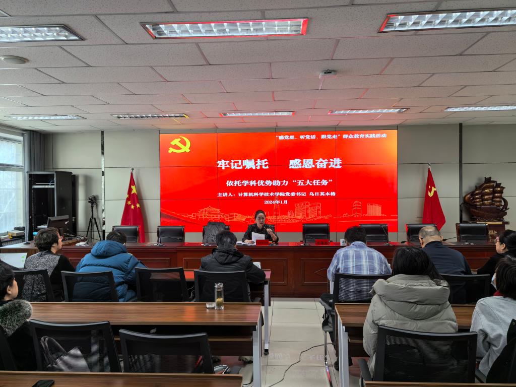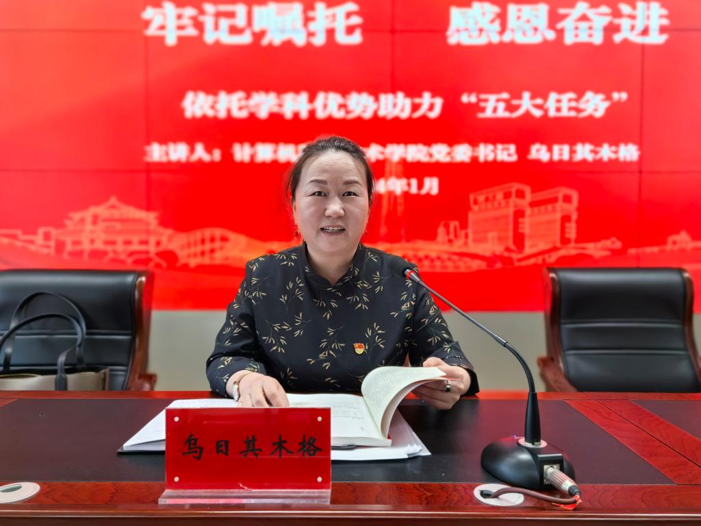 为深入学习贯彻党的二十大精神,深刻领悟习近平新时代中国特色社会主义思想的真理力量和实践伟力,特别是学懂弄通做实这一重要思想的“内蒙古篇”和“民族篇”,全面落实习近平总书记交给内蒙古的五大任务和全方位建设“模范自治区”两件大事,进一步深化主题教育成果,按照《Beat365唯一官方网站“感党恩、听党话、跟党走”群众教育实践活动实施方案》要求,1月9日Beat365唯一官方网站党委书记乌日其木格为学院全体教职工讲授主题为《牢记嘱托,感恩奋进,依托学科优势助力“五大任务”》的专题党课。