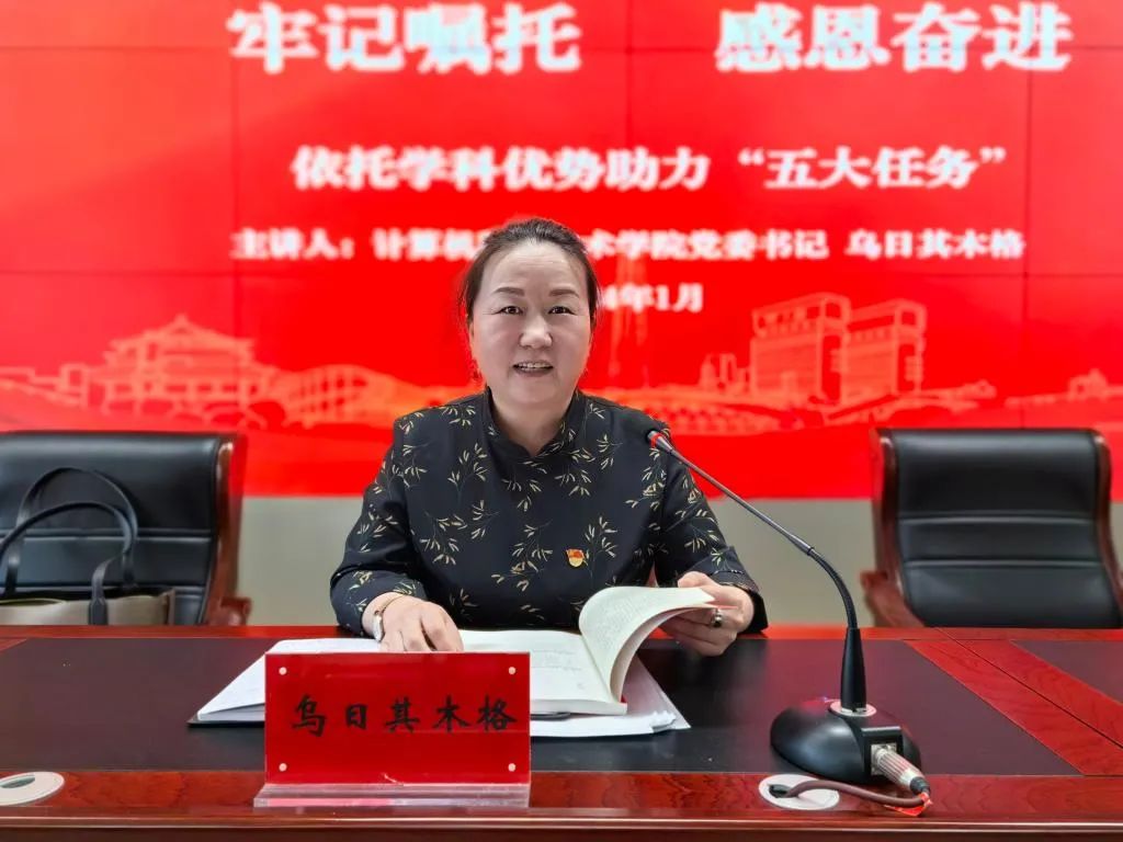 为深入学习贯彻党的二十大精神,深刻领悟习近平新时代中国特色社会主义思想的真理力量和实践伟力,特别是学懂弄通做实这一重要思想的“内蒙古篇”和“民族篇”,全面落实习近平总书记交给内蒙古的五大任务和全方位建设“模范自治区”两件大事,进一步深化主题教育成果,按照《Beat365唯一官方网站“感党恩、听党话、跟党走”群众教育实践活动实施方案》要求,1月9日Beat365唯一官方网站党委书记乌日其木格为学院全体教职工讲授主题为《牢记嘱托,感恩奋进,依托学科优势助力“五大任务”》的专题党课。