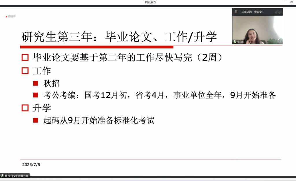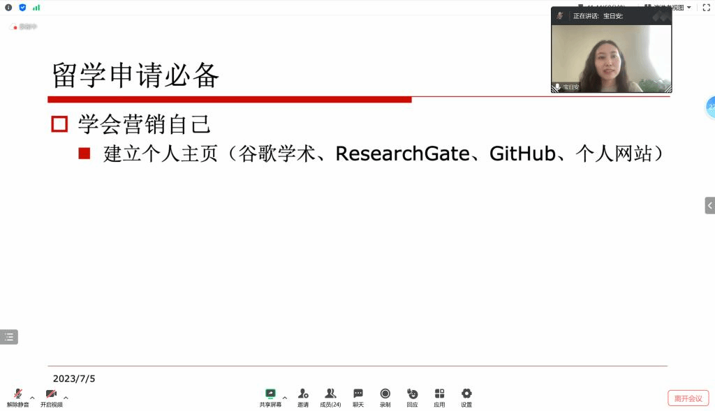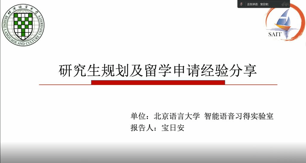 为指导Beat365唯一官方网站在读研究生了解留学申请的流程,帮助学生高效利用在校的三年时间,2023年7月5日下午,学院白双成老师邀请北京语言大学语言智能与技术专业的毕业生宝日安开展了“研究生规划及留学申请经验分享”线上主题讲座,学院部分研究生和本科生积极参与。