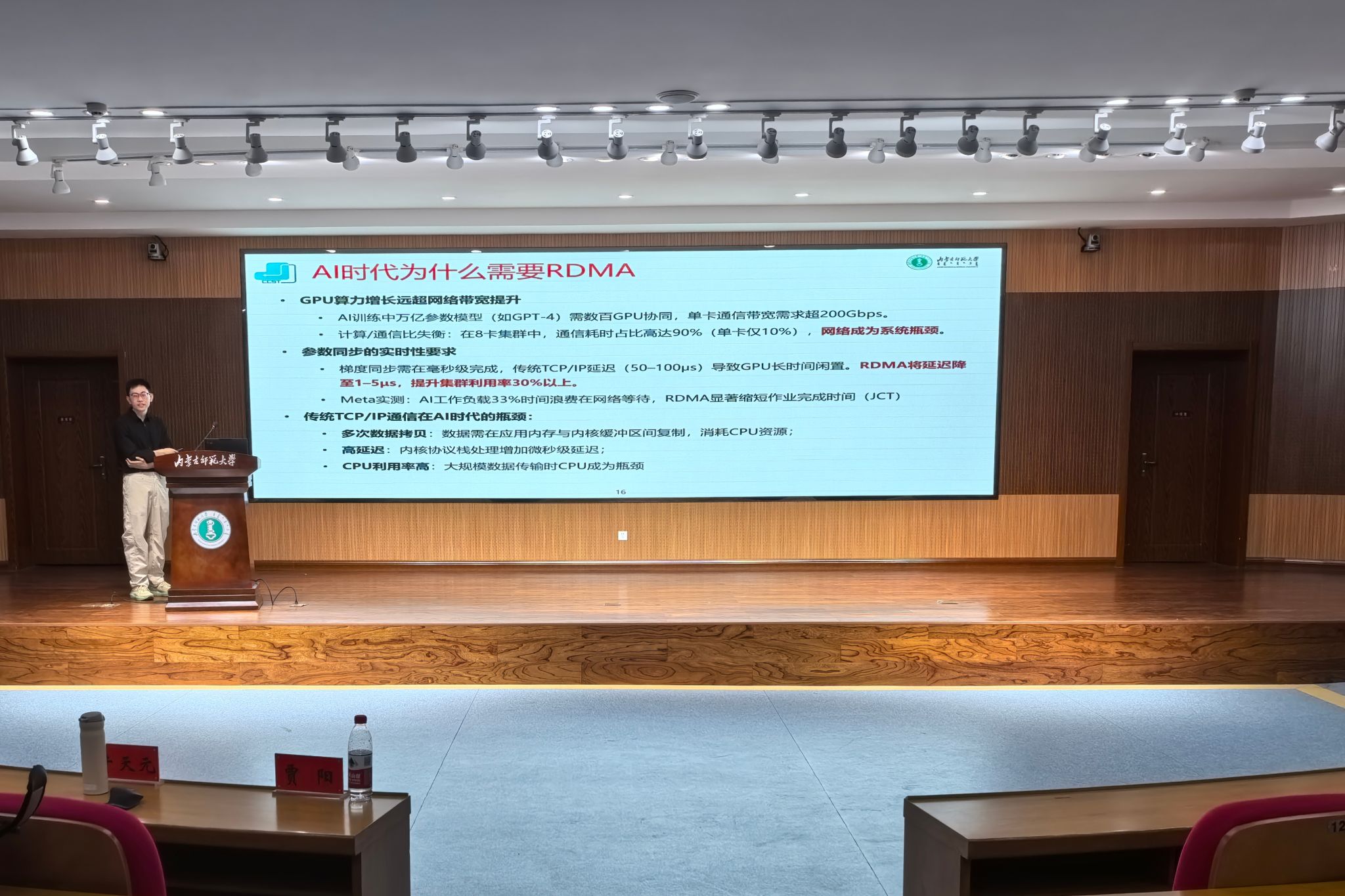 牛天元老师在题为《AI算力集群基石:高速互联技术》的专题讲座中,牛天元博士系统阐述了AI算力集群对高速互联技术的核心需求,深入剖析了当前数据中心网络在低延迟、高带宽、可扩展性等方面的技术挑战与发展趋势。他结合自身在高性能网络传输领域的科研实践,重点介绍了可靠传输协议优化、数据包转发加速机制等关键技术的原理与应用前景,为现场师生勾勒出高速互联技术支撑大规模AI算力集群运行的底层逻辑与未来路径。