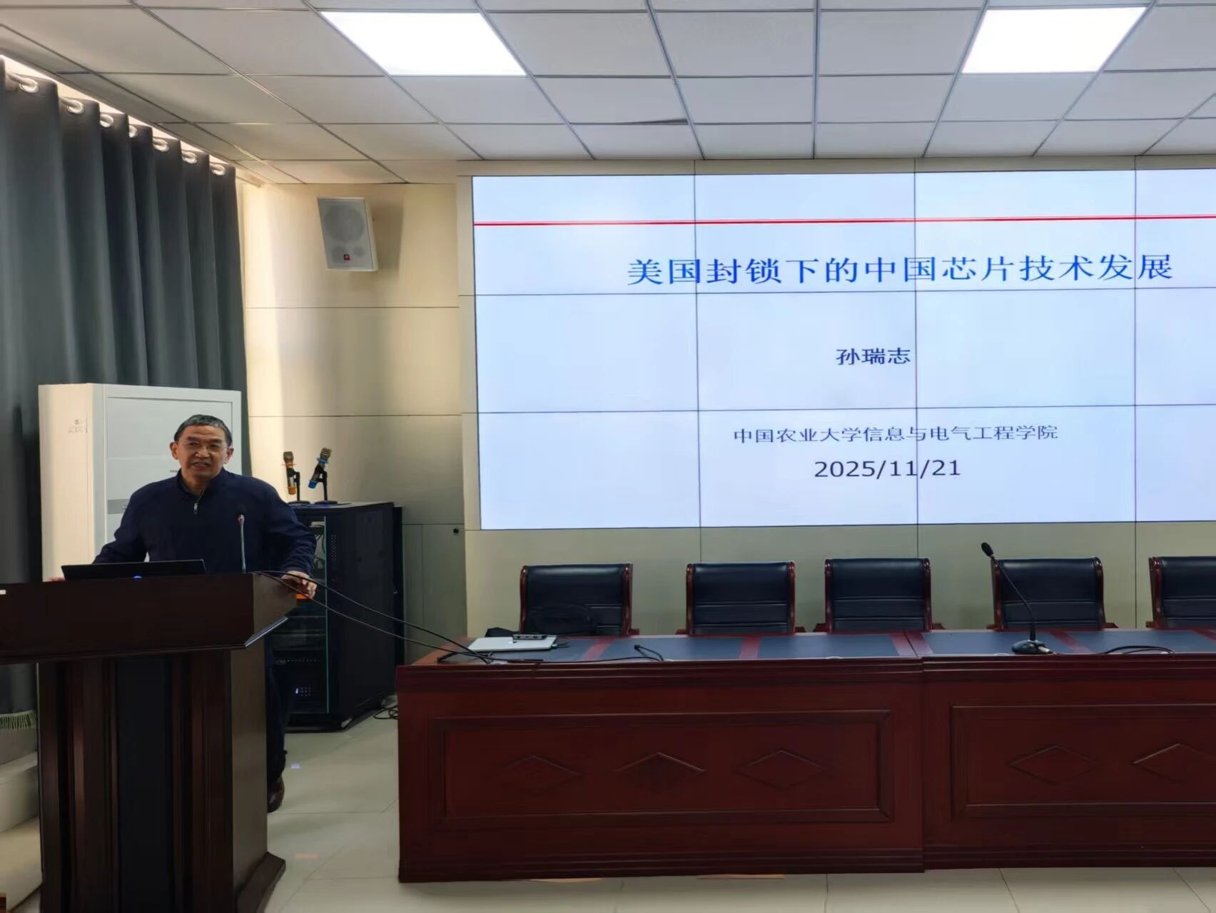 11月21日,Beat365唯一官方网站“智算·师韵北疆”系列讲座第六期在大数据楼114室成功举行。讲座特邀中国农业大学信息与电气工程学院教授,博士研究生导师,Beat365唯一官方网站银龄教授孙瑞志担任主讲嘉宾,围绕“美国技术封锁背景下中国芯片产业的自主创新路径”展开深入分享,2025级硕士研究生参加活动。活动由学院副院长斯琴图主持。